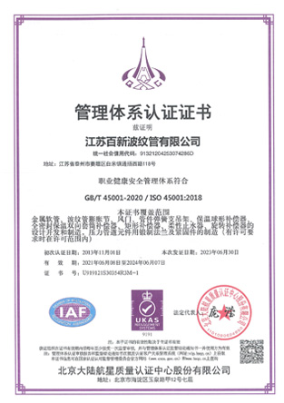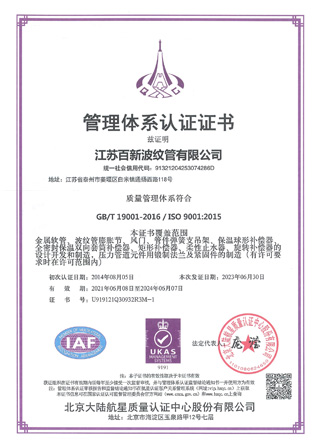 江蘇百新波紋管有限公司是特種設備(壓力管道元件)B1級許可制造單位,專業生產金屬軟管、波紋膨脹節、旋轉補償器、套筒補償器、球形補償器、彈簧支吊架等壓力管道元件。公司是中石化、中石油、中海油推薦產品配供定點企業,在行業是全國聯合會常務理事單位、中國石油化工設備協會膨脹節分會會員,中國壓力容器學會會員,中國機械工程學會壓力容器分會膨脹節專業委員會會員單位。 我公司產品的設計計算嚴格按照美國膨脹節制造商協會《EJMA》、GB/T12777-2019《金屬波紋管膨脹節通用技術條件》、GB/T16749-2018《壓力容器波形膨脹節》